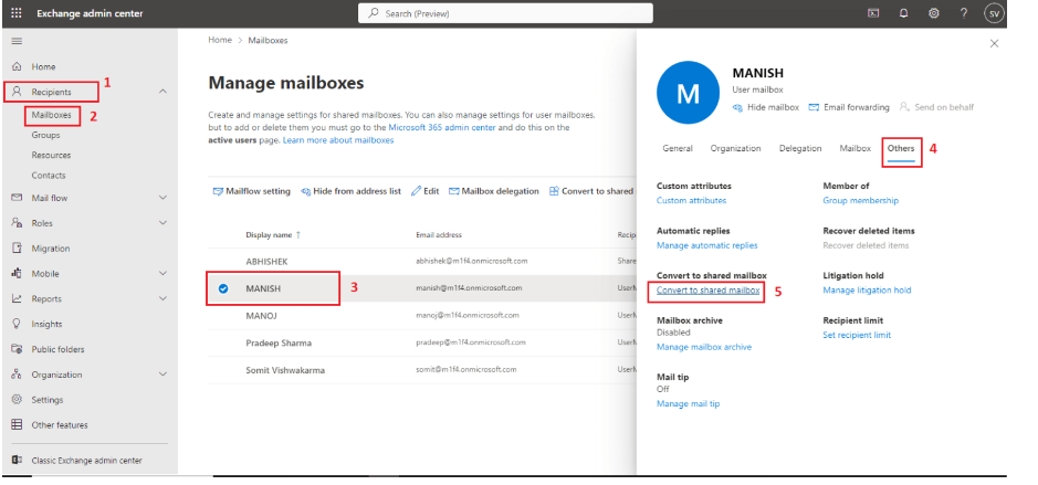Step 3: Convert the User Mailbox to a Shared Mailbox (see steps below)